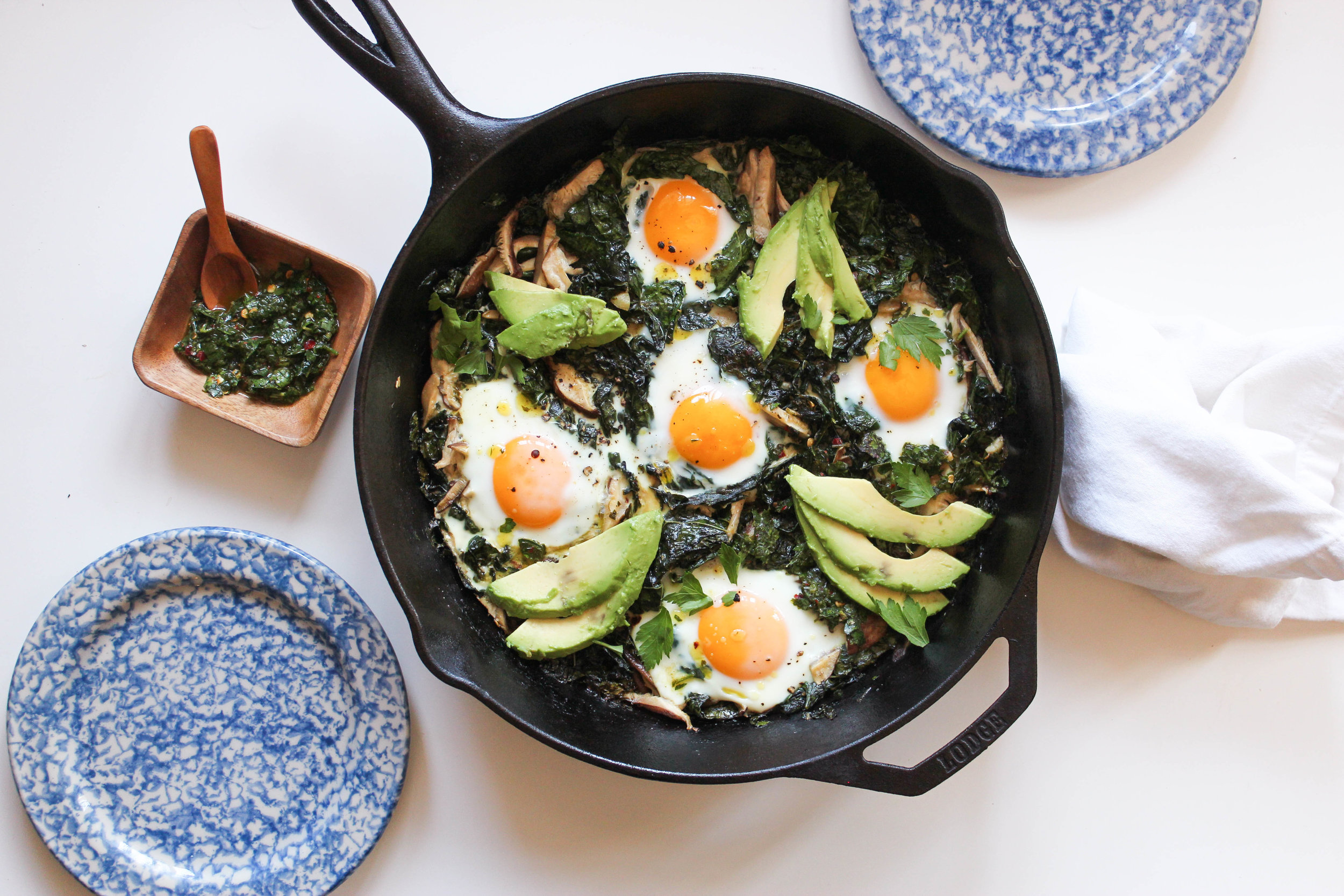 KALE, MUSHROOM & CHIMICHURRI BAKED EGGS